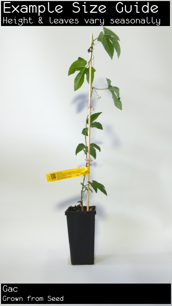 A perennial melon noted for its orange-red flesh, native to SE Asia. The aril around the seeds is a deep brilliant red, high in the carotenes lycopene and betacarotene. Traditionally, it is much esteemed as a superfood and is cooked in a variety of ways to enhance flavour. It can be made into both sweet and savoury dishes. Green fruits can also be cooked as a vegetable. Vines are either male or female so both are required for the plants to set fruit. Unusually, Gac vines may change between being male and female and may change from one season to the next. Hand pollinating allows for a better crop. They are a very vigorous vine and grow to 15m in any direction and require yearly pruning to suit the trellis built for it. In fact pruning the vegetative growth will increase fruit size. Suited to subtropical climates, but can be grown outside of this range with care. Will lose its leaves for the winter in a cool climate. In tropical areas its vigorous habit needs care.