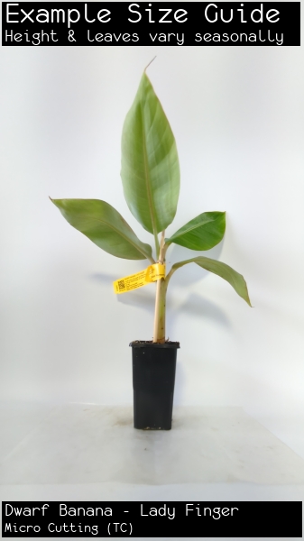 A small version of the popular Lady Finger Banana. Expect plants from 3.5 to 4m high. Sweet and tangy, the Lady finger is a good sized fruit with a thin skin.