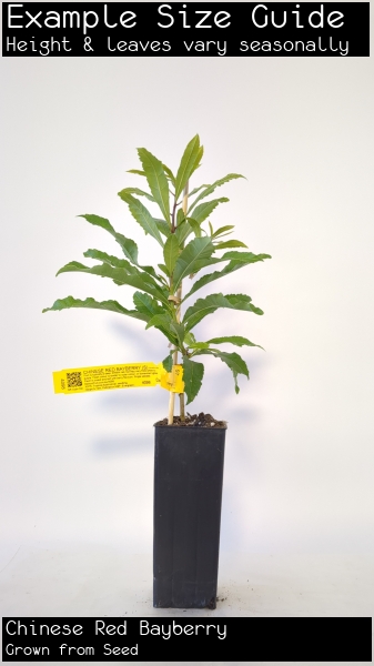Fruit is typically a deep, brilliant red, but may vary from white to purple. Flesh colour is similar to outer colour, or somewhat lighter. Flesh is sweet and tart with berry flavours. Single seeded. Besides eating fresh, the fruits may be dried, canned, soaked in liquor. The bayberry is an evergreen dioecious tree with separate male and female plants. Our seedlings are not sexed and it is recommended to grow at least 3 to be assured of at least one female.