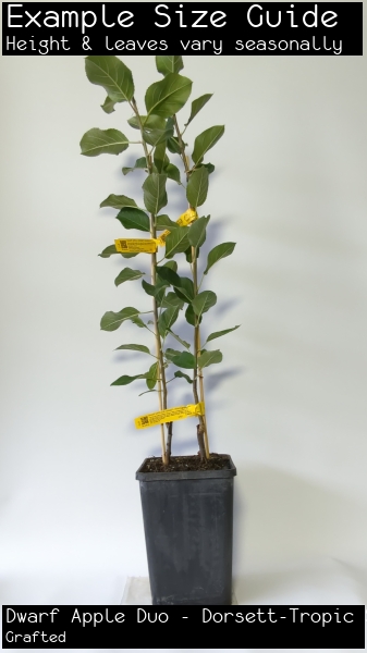 Two low chill apple varieties in one pot. Plant a pollinating pair in one hole and prune as if one tree. Golden skinned Dorsett Golden and red skinned Tropic Sweet, sweet apples suitable for fresh eating and cooking. Dorsett Golden is a golden skinned apple with a beautifully tangy, sweet flavour and Tropic Sweet has a red blush skin and sweet flavour, similar to the Johnathon. The subtropical varieties are best when eaten fresh off the tree, and not used for extended storage. You can grow in a large pot, as an espalier or in the ground. Duo plantings are perfect for small back yards. Prune regularly to maintain compact shape, taking all inward pointing branches out. Provide nutrition slightly more than for one tree. Suitable for warm temperate to subtropical climates. Protect trees from late frost if you are in a more temperate area.