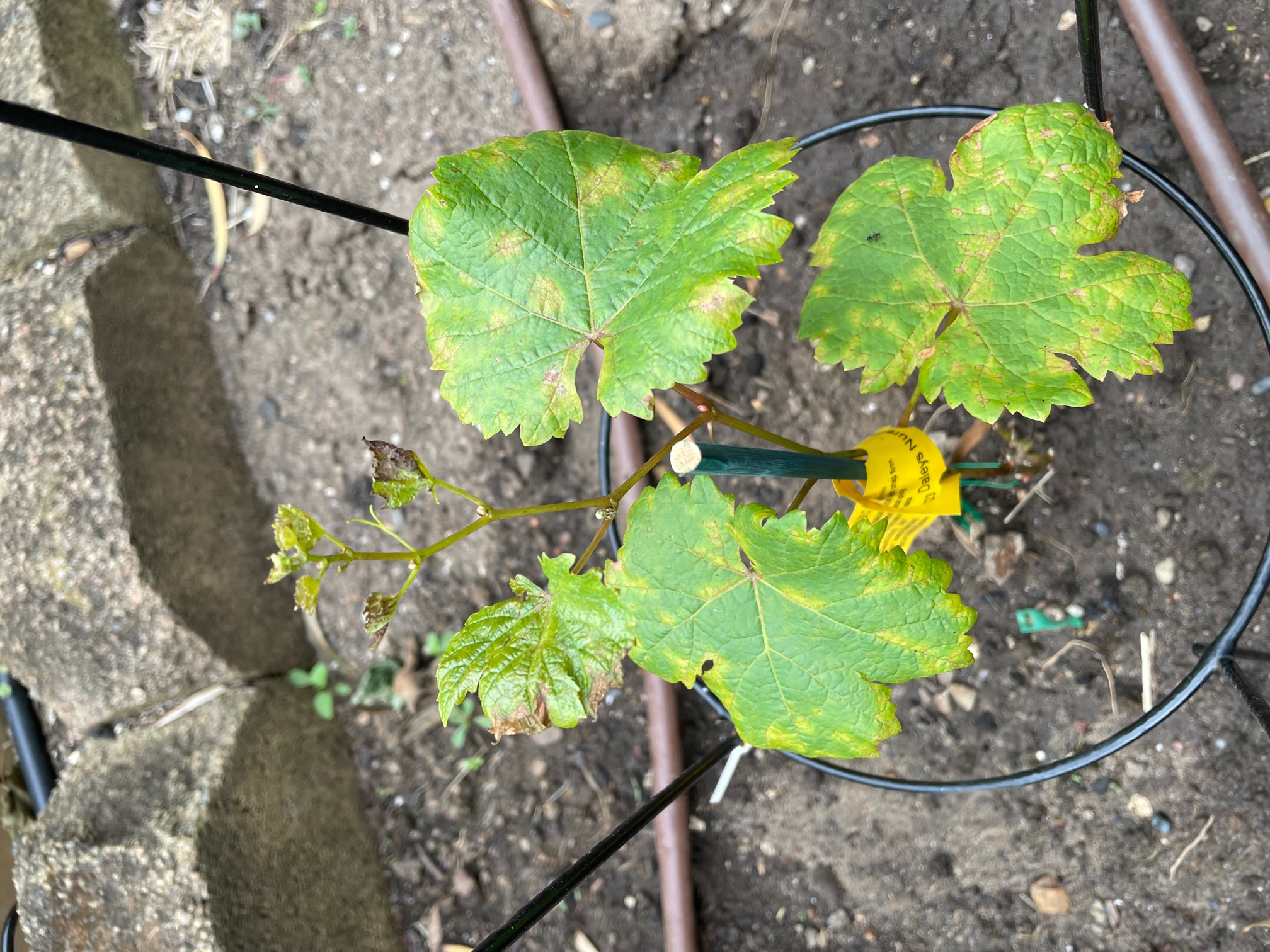 After planting my grape vine seems growing, however the leaves now showing something not healthy, can someone please help me to identify what is wrong here?