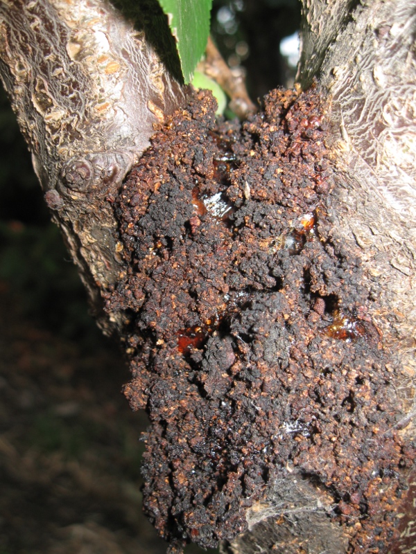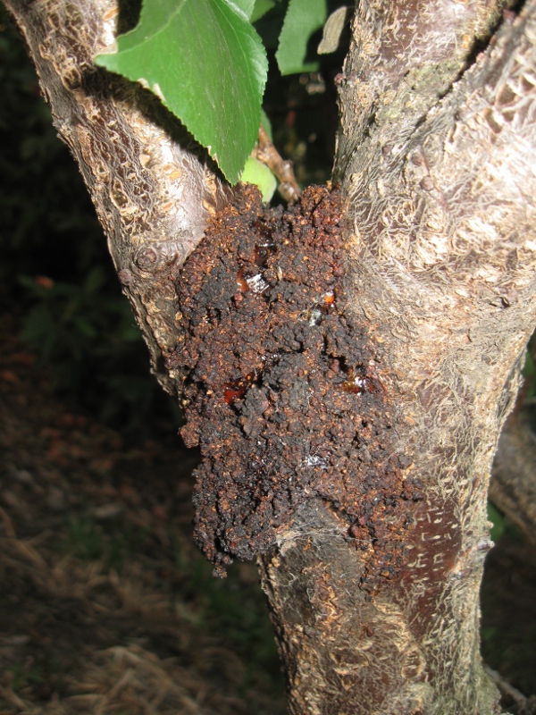 Mark, It looks like you have a borer, and most likely multiple borers. They are capable of ring barking the tree. The gum is produced by the tree to try and protect itself but does more to protect the borer. Scrape the gum off, insert a piece of wire into any hole you find and you should hook out a grub. Some of the grubs are very small so I spray the area with pyrethrum in case I miss any. A systemic insecticide will also do the trick but I prefer the former method.