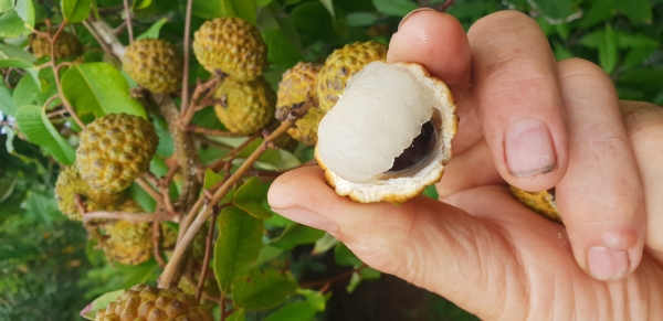 About Photo: Peeled Alupag fruit showing flesh and seed above bunch of ripe fruit