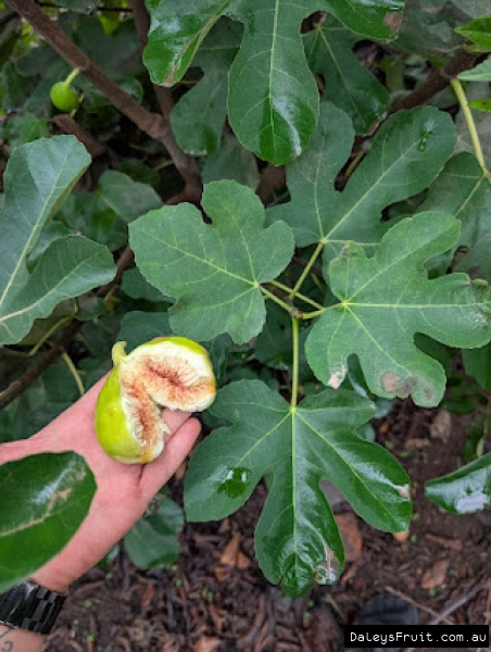About Photo: Excel Fig halved to show amber flesh beside leaves
